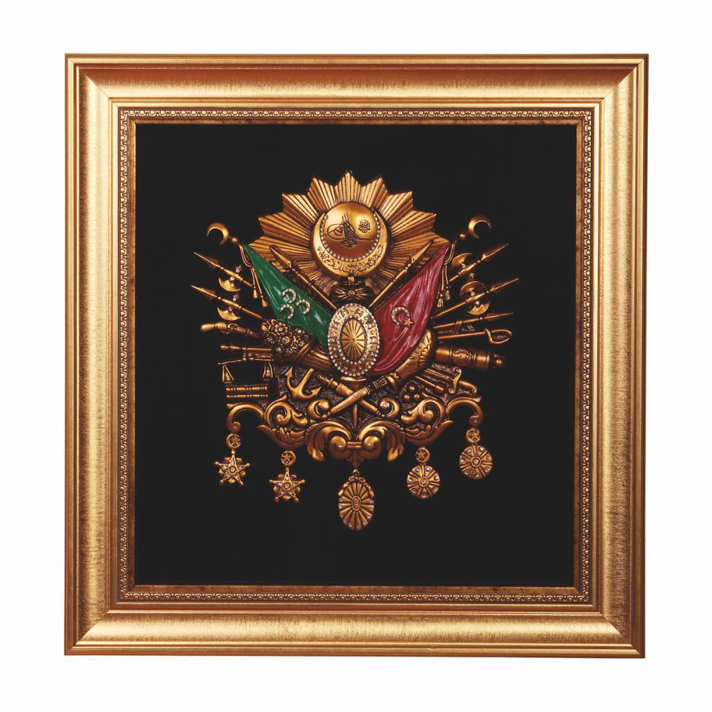 MDF üzeri flog kaplamalı zemin üzerine poliüretandan üretilmiş Osmanlı Arması tablosu el işçiliği ile Türkiye'de üretilmiştir. Çerçevesi eskitme ahşap görünümlü sert plastikten imal edilmiştir.